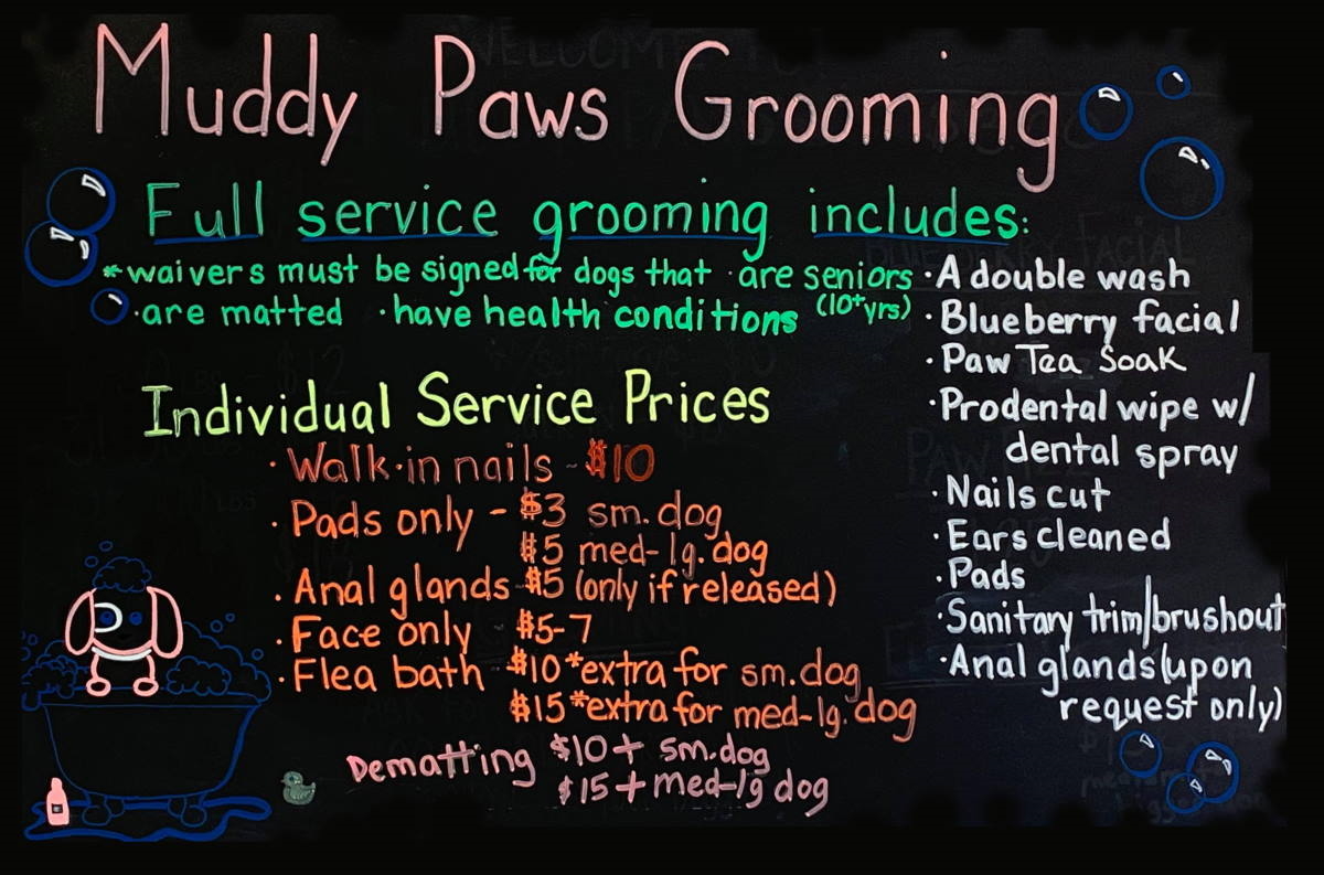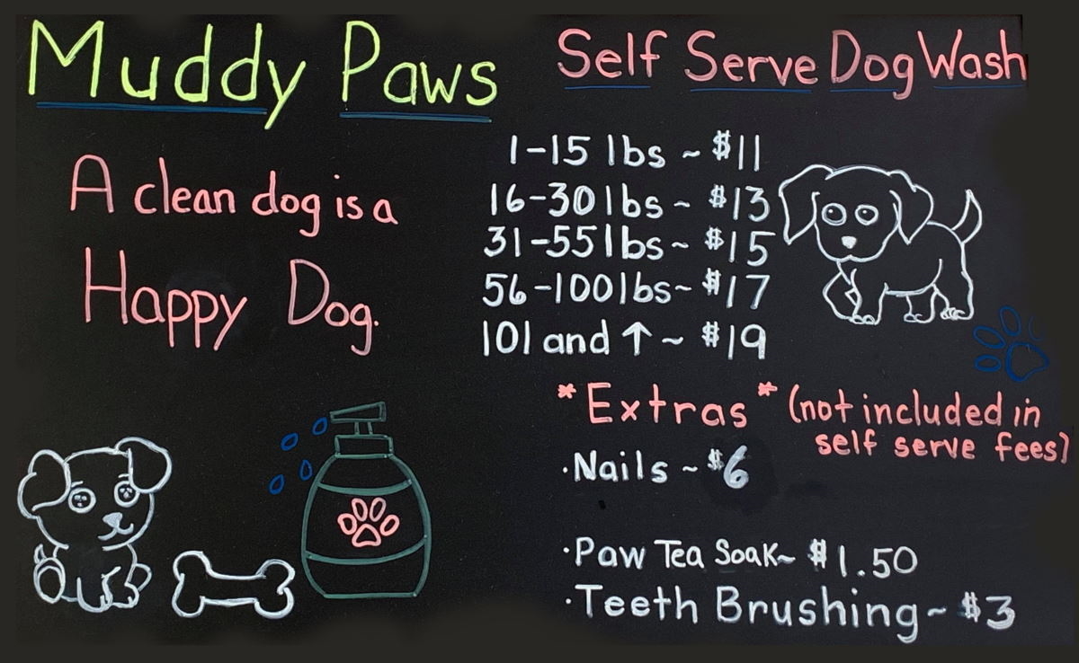 At Muddy Paws, we are not just another dog wash. We strive to offer a stress free experience for your dog. We take time with each dog. We offer a holistic approach to your dog's hygiene and emotional health. Our staff is patient, gentle, and experienced. We pamper your pooch with the latest techniques and products.